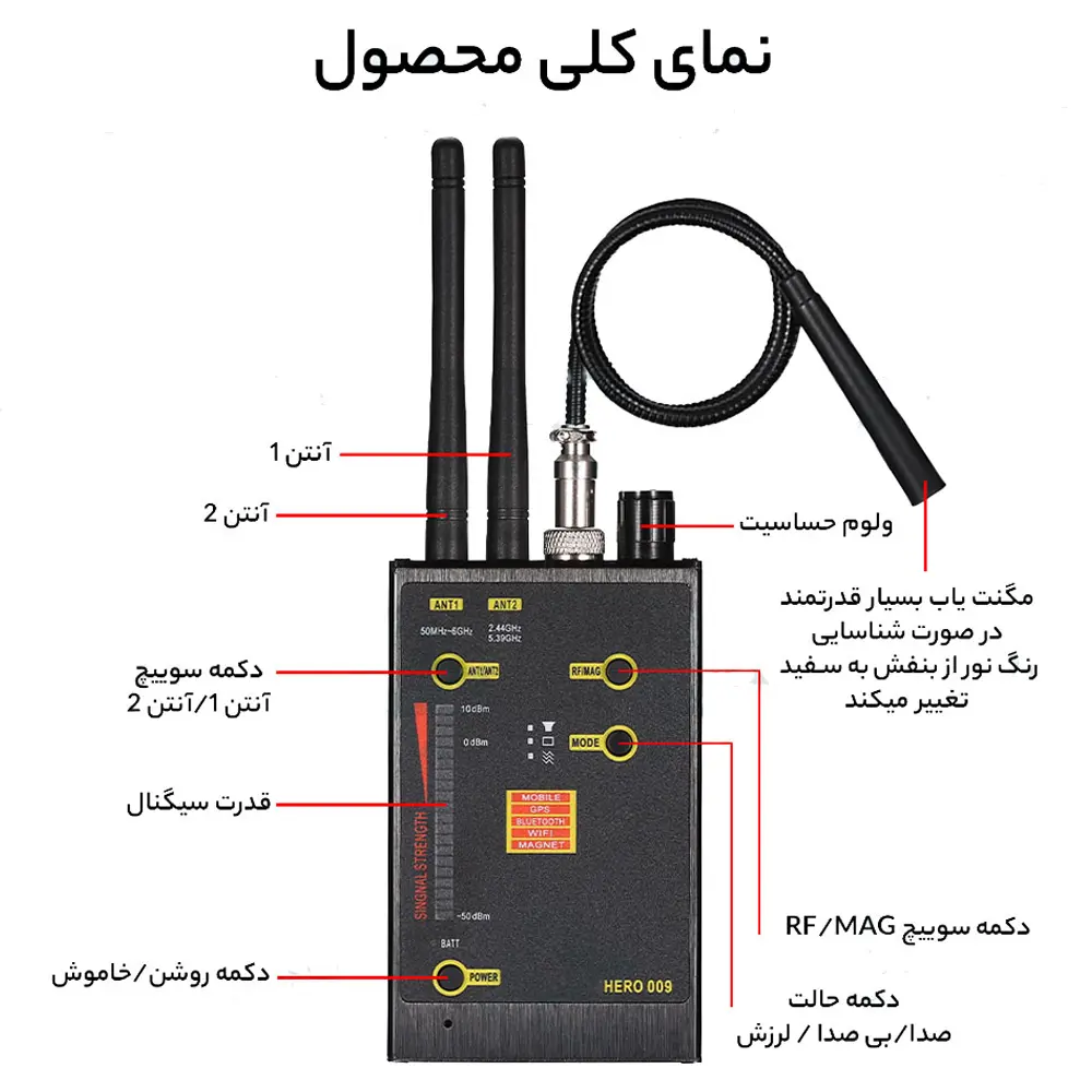 دستگاه H009 نه تنها یک آشکارساز است، بلکه سپر دیجیتال شما در برابر جاسوسی مدرن است. با ترکیب دو آنتن هوشمند، محدوده فرکانسی 6 گیگاهرتزی، باتری با عمر بالا و عملکرد بدون خطا، این دستگاه به بهترین گزینه برای کسانی تبدیل شده که به دنبال امنیت حداکثری و دقت حرفهای هستند.